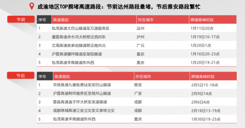 成渝地区,成都和重庆都是人口超千万的城市,进出城压力最大。同时由于该地区独特的地形地貌,拥堵路段多集中在隧道,其中包茂高速羊角隧道是最容易发生拥堵的路段,从时间上看,1月19-20日是去程高峰,拥堵时段多集中在晚上,其中19-21点最易发生拥堵,返程拥堵时间较长,从1月30日持续到2月18日。