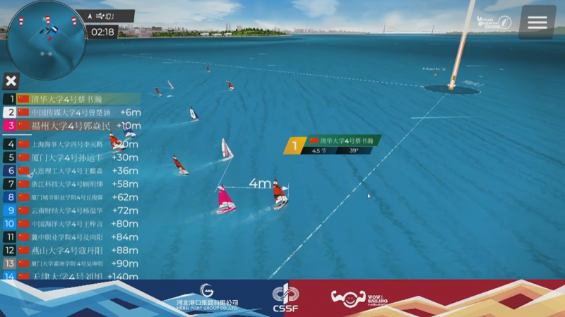 作为专为大学生群体打造的高水平帆船赛事,比赛在规则设计上充分兼顾专业性与校园特色。竞赛系统以真实海洋环境数据为基础,模拟不同风力、洋流等复杂海况,选手需通过实时调整帆角、航向等参数应对赛场变化,非常考验对帆船运动原理的掌握,为帆船运动在校园的普及注入新活力。开赛首日,各高校队伍迅速进入竞技状态,赛场亮点频出。现场演播厅内,参赛队员们紧盯屏幕、实时沟通,展现出大学生群体的竞技热情与青春活力。