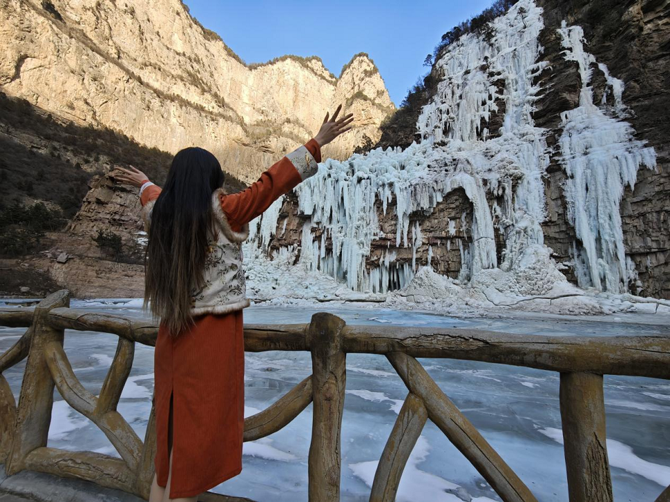 灵石的新春,不止有古建与人文的雅致,更有山野冰雪的激情与浪漫。驱车驶入太岳山麓,红崖峡谷的冬日限定冰瀑秘境,惊艳了时光。往日飞泻的瀑布被低温定格,十余米高的冰瀑壁挂在阳光中折射出琉璃般的光晕,“北方小九寨”的冬日盛景,成为新春里最动人的自然画卷,游客身着汉服或亮色冬装立于冰瀑前,人与自然的美好,在此刻定格。而峡谷的滑雪场里,雪道宽阔、雪质优良,滑雪、雪圈等项目一应俱全,冰雪运动的快乐,让冰天雪地间充满欢声笑语。