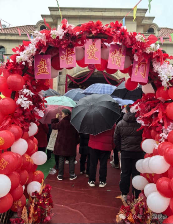 红地毯铺起来了,“爱情门”搭起来了,音响里循环播放着《甜蜜蜜》《最浪漫的事》,一场乡村新春相亲会正在雨中温情上演。